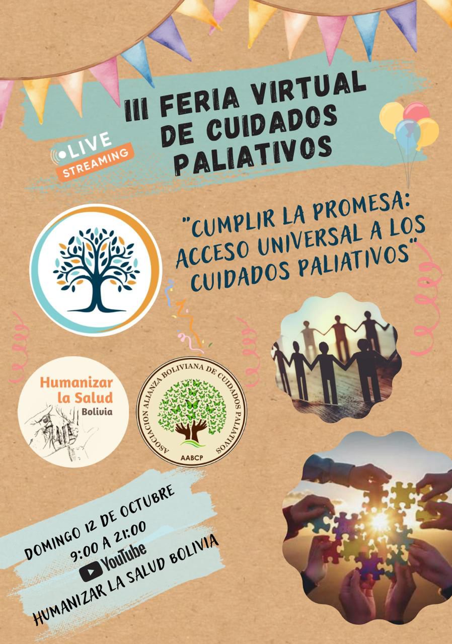 La 3ª Feria Virtual de Cuidados Paliativos se realizara este domingo 12 de octubre, en una transmisión en vivo de 9 am a 9 pm por el canal de youtube de Humanizar la Salud Bolivia. Es un evento inédito que busca informar, sensibilizar y abrir el día logo sobre un tema todavía poco conocido, pero esencial para la calidad de vida de miles de personas: los Cuidados Paliativos (CP).